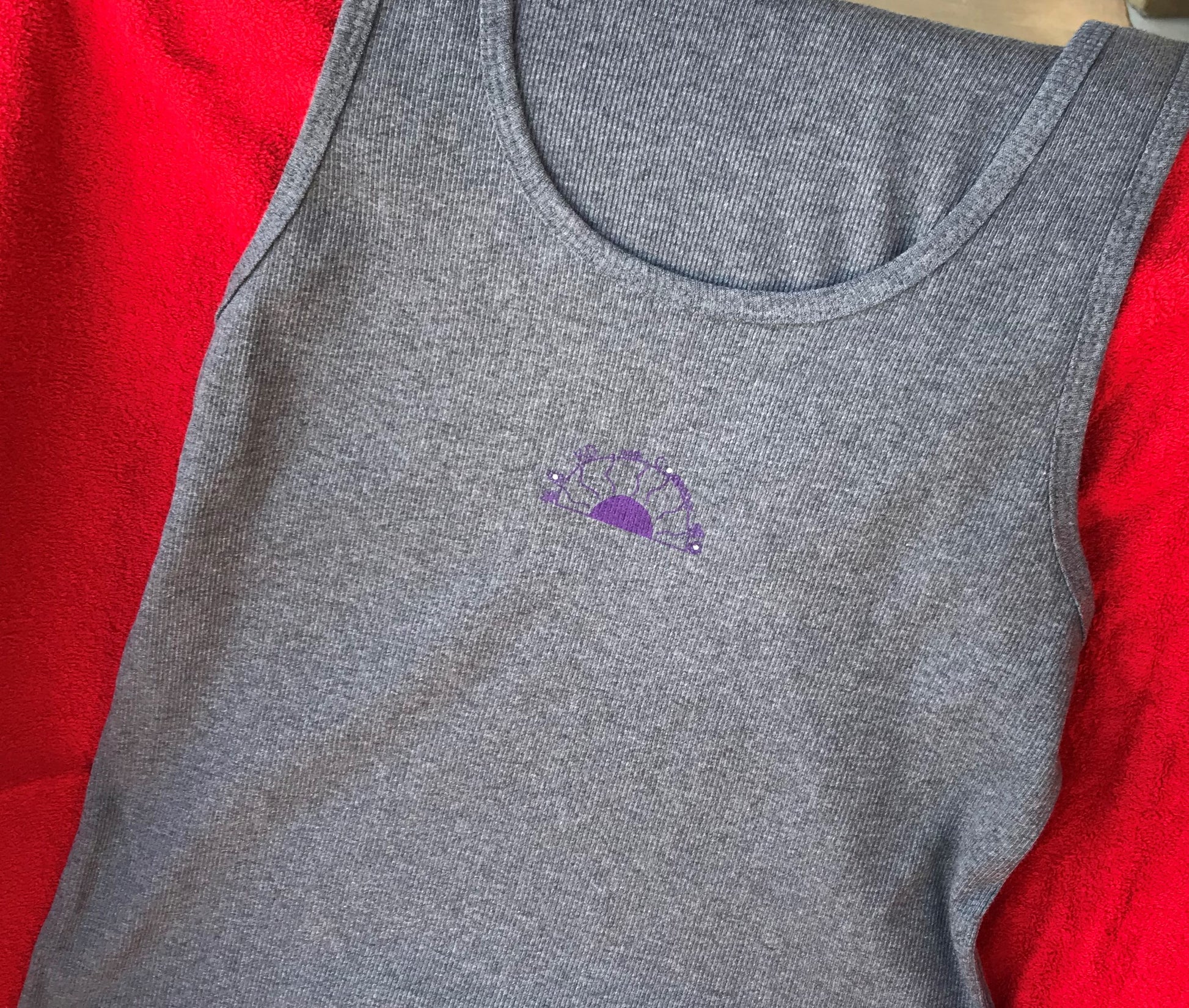 KD and Company Tank Top in Gray ribbed fabric, well made, with KD and Company Logo in purple and three tiny rhinestones. Nothing on the back.