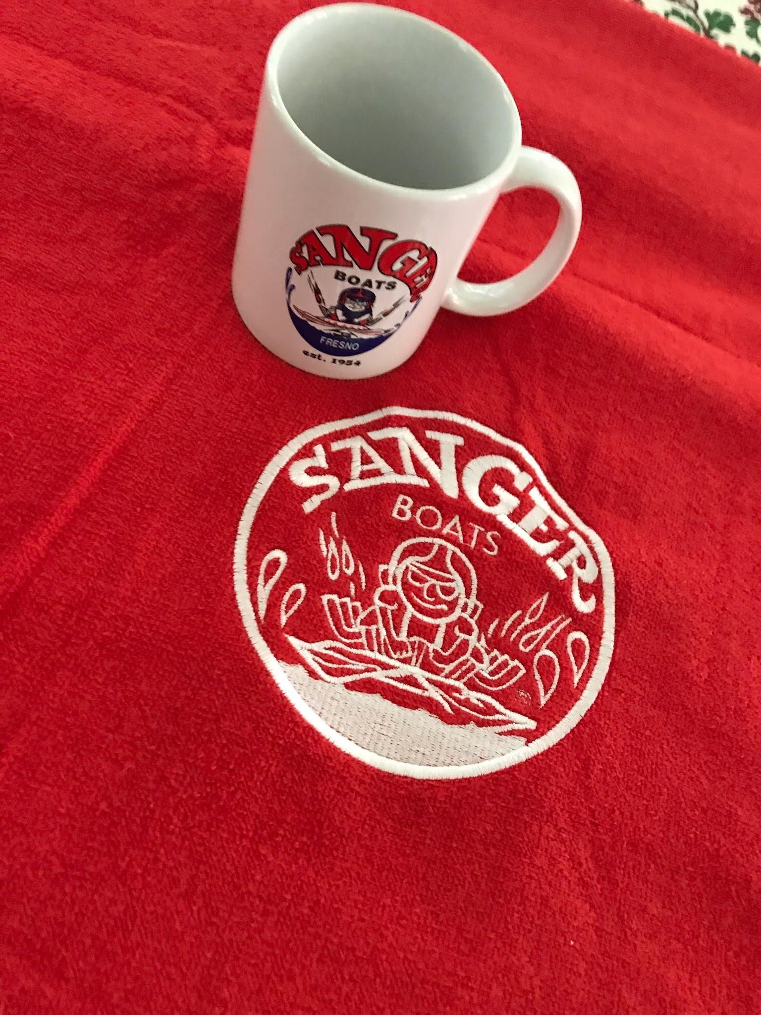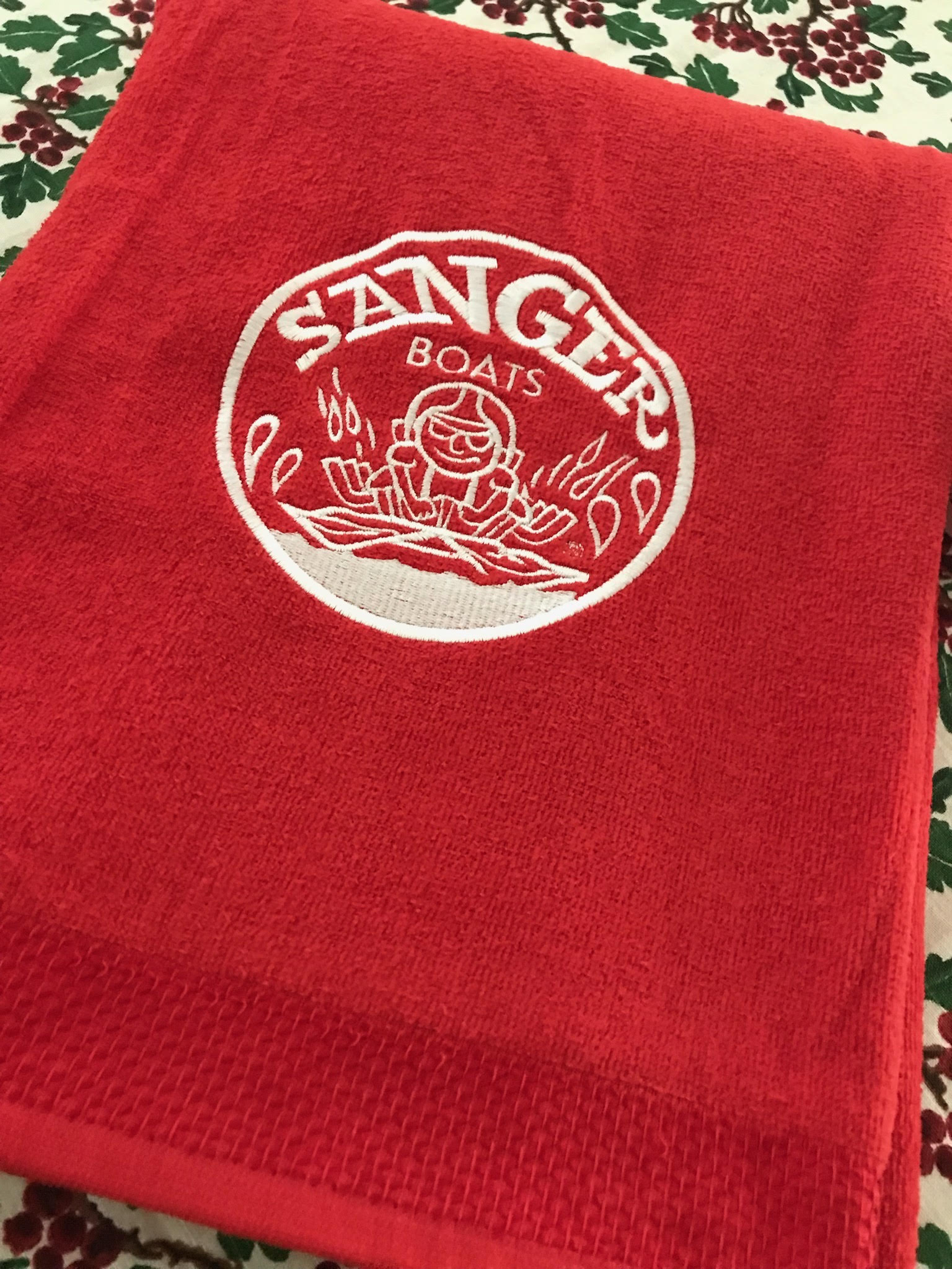 30X60 Red Velour Towel with Embroidered Sanger Hydro Guy Logo in White